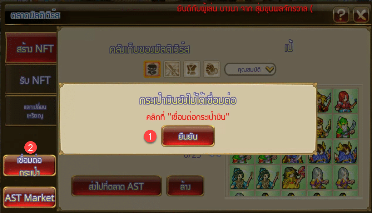 เราสามารถทำการเชื่อมกระเป๋าดิจิตอลกับตัวเกมได้ โดยจะทำให้เราปลดล็อกฟังก์ชั่นในการซื้อขายบนตลาดรวมถึงแลกเปลียนเหรียญได้ ซึ่งวิธีการเชื่อมสามารถทำได้ดังนี้ครับ