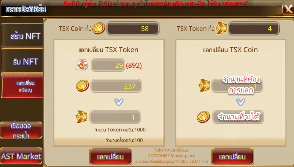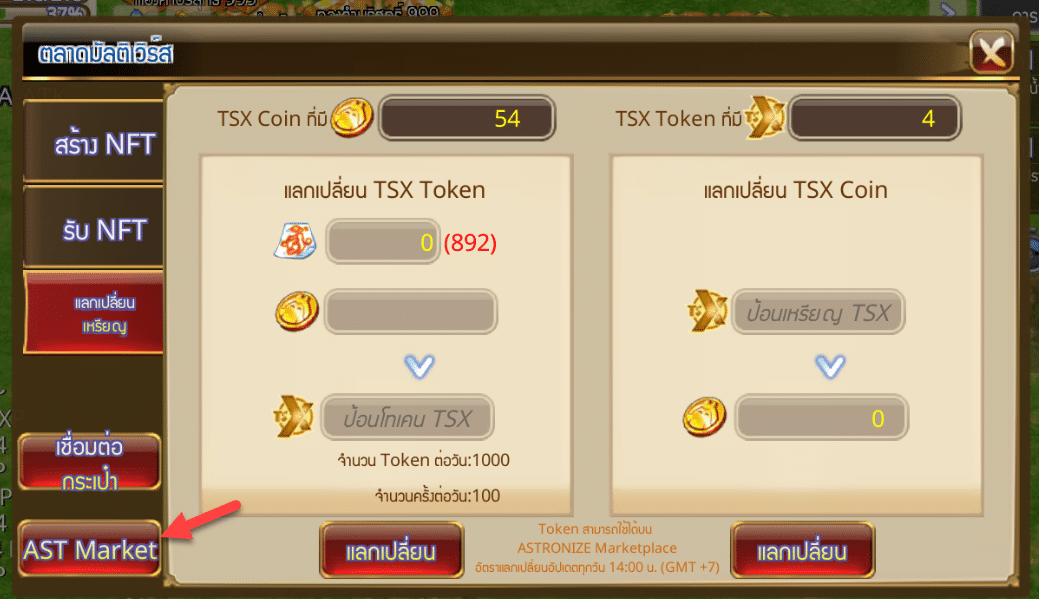 4.หลังจากเชื่อมกระเป๋าเรียบร้อยแล้ว เราจะสามารถแลกเปลี่ยนเหรียญ TSX ในเกมให่กลายเป็น TSX Token ซึ่งเอาไปใช้ซื้อของใน Marketplace บนได้โดยสามารถเข้าได้โดยการกดที่ AST Market ทางด้านซ้ายมือ สำหรับการเข้าไปที่ Market