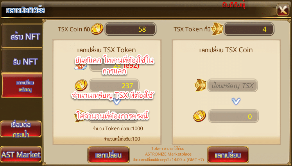 ทำได้โดยการใส่จำนวน TSX ที่ต้องการ ระบบจะทำการคำนวณให้ว่า 1 TSX ต้องใช้เหรียญ TSX Coin จำนวนเท่าไหร่ โดยจะมีค่าธรรมเนียมเป็นยัตต์แลกโทเคน จะสามารถหาได้จากกิจกรรมต่าง ๆ หรือหาได้จากในร้านค้า (ในช่วง CBT ยังไม่มีขาย)